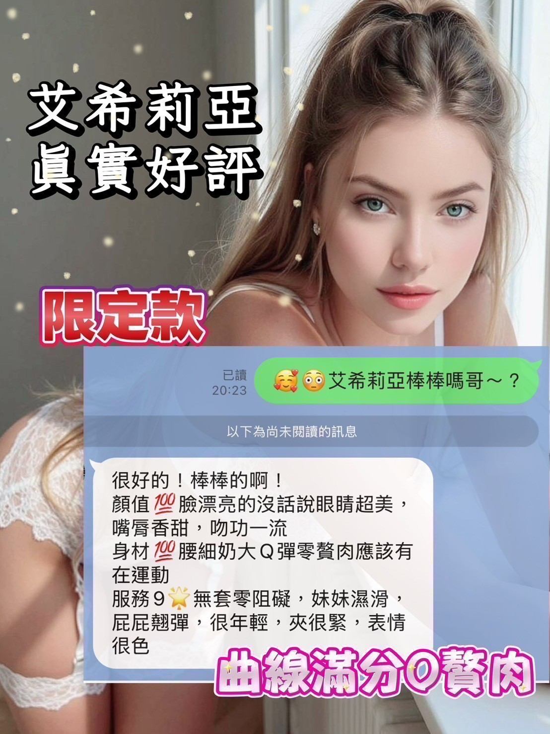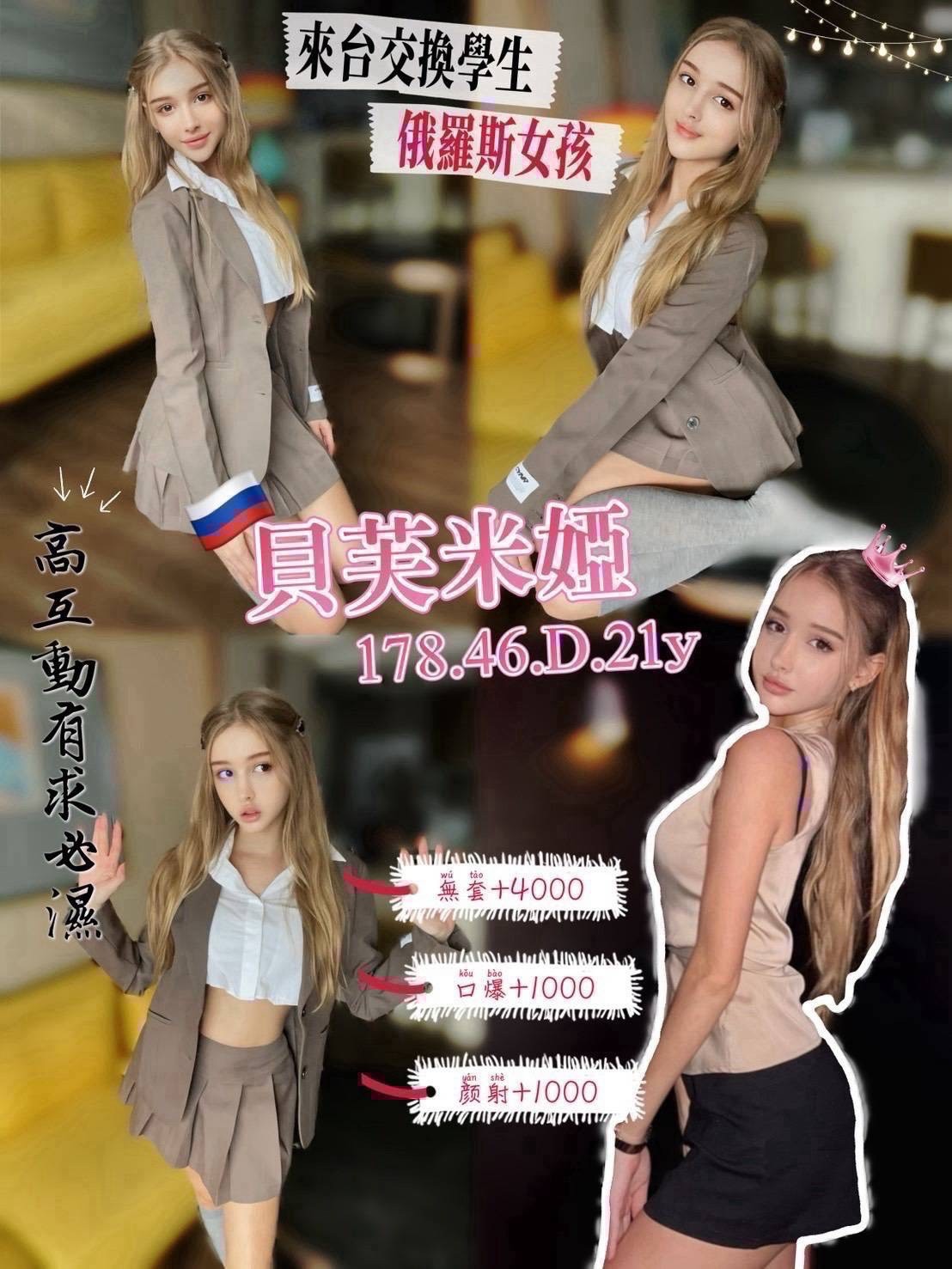 主打➡🇷🇺俄羅斯來台交換學生線上知名內衣小模,渾圓翹臀奔放性愛。態度滿分不打槍,究極美尻,真人芭比女神,難得的勻稱修長身材,回客不斷,熱銷紅牌。